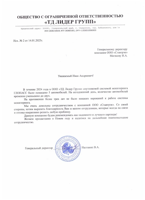 Благодаря системе ГЛОНАСС от компании «Ставтрэк» мы получили полноценный контроль над нашими автомобилями 24 часа в сутки. Заметно улучшились показатели дисциплины водителей, значительно уменьшилось количество нарушений и практически исчезли случаи превышения скорости. Выражаем благодарность сотрудникам «Ставтрэк», отмечая их высокий профессионализм и внимательное отношение к клиентам.